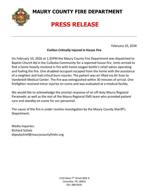 Maury County Fire Department responded to a reported barn fire