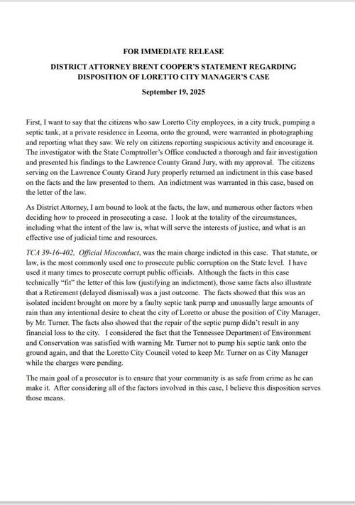 Beginning Wednesday morning (10/1/25) at 8am, the westbound lane of Weakley Creek Rd between Hwy 43 and the railroad track will be closed indefinitely as work is done on a sewer main.
