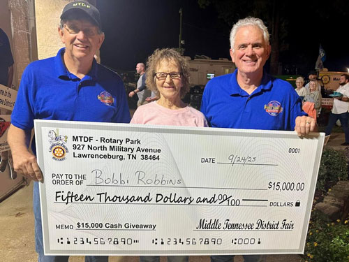 Bobbie Robbins was the lucky winner of the $15,000 drawing on Wednesday night at the Middle Tennessee District Fair in Lawrenceburg.
