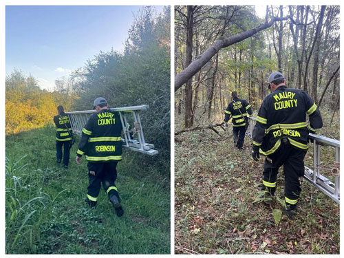 Units were able to walk directly to the subject due to prior work by Maury County 911 to ensure our responders can find exactly where a 911 caller is located. The person was assisted out of the tree with a 24’ ladder that was carried in by members.
