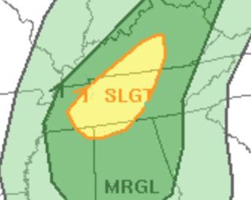 The Storm Prediction Center has placed Wayne, Lawrence, and Giles counties under a Slight Risk (Level 2 of 5) for severe weather on Friday afternoon. Timing is late afternoon / early evening with primary threats being damaging straight line winds and an isolated tornado. Local residents should be weather alert on Friday and have at least two methods available to receive watch and warning information.