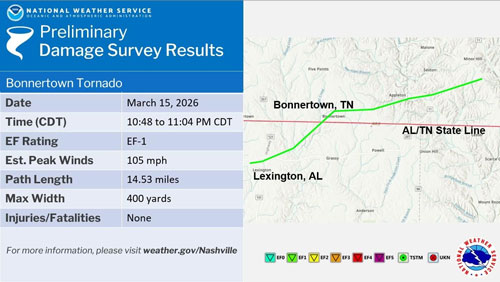 Rabbit Trail Road (TN-98) at Bonnertown is closed due to Tornado damage and downed power lines across the road. Officials estimate the road will re-open around 6:00 am this morning (Monday, 3/16/26).