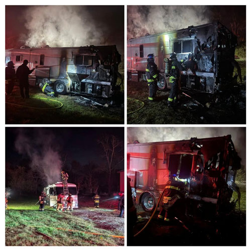 Our Tanker 21 responded on automatic aid to the City of Columbia. During the response the location was updated by a second caller to Canyon Drive, which was now in our jurisdiction with the caller reporting an RV on fire connected to a racing trailer which was loaded with racing fuel and equipment.